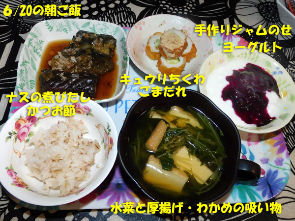 これだけ朝作ったわけではありません。ナスの煮びたしもキュウリちくわも水菜の吸い物も、全部昨夜のおかずをとっておいたもの。あらたに準備したのは、プレーンヨーグルトに今作ったブルーベリージャムをのせたものだけ。あ、ご飯も残りご飯です。