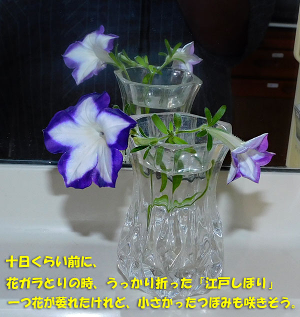 もう一つ。これは、サフィニアアートの「江戸しぼり」毎朝花ガラを取ってきれいにしているのだけれど、手袋をしていたせいで、うっかり横のまだキレイな花茎を折ってしまった!!