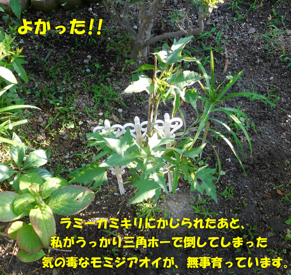 これは、ラミーカミキリに新芽をほとんど食べられていたモミジアオイです。