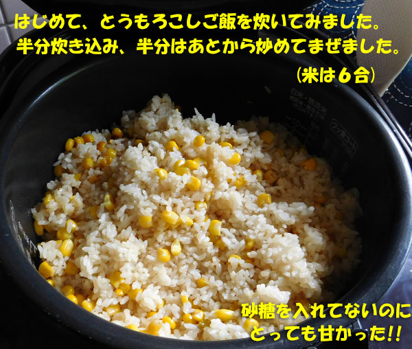 初めて作ったトウモロコシご飯は、母も旦那も大喜びでした。炊き込みご飯のだしの味付けは適当。バターを1かけと、コンソメスープ、昆布だしも入れていました。