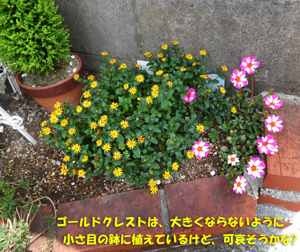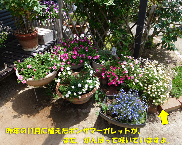 11月に植えたボンザマーガレットの生き残り。黄色がまだまだ咲いていますよ。