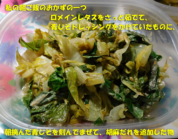 そうそう、庭仕事のあとに、今日の朝摘んだ青じそ(三枚)を、昨日のおかずの残りにまぜて食べました。