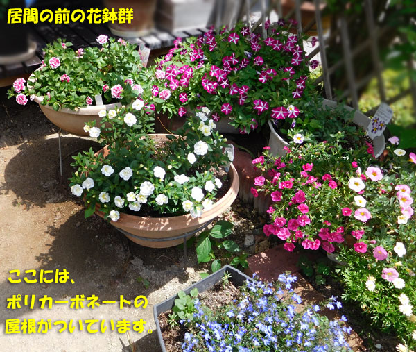 ペチュニアの仲間は、雨に濡れたら弱いので、濡れ縁のそばに置いていますが、ここはポリカーボネートの屋根がついているので、大丈夫。その代わり、水やりに気をつけないと!!