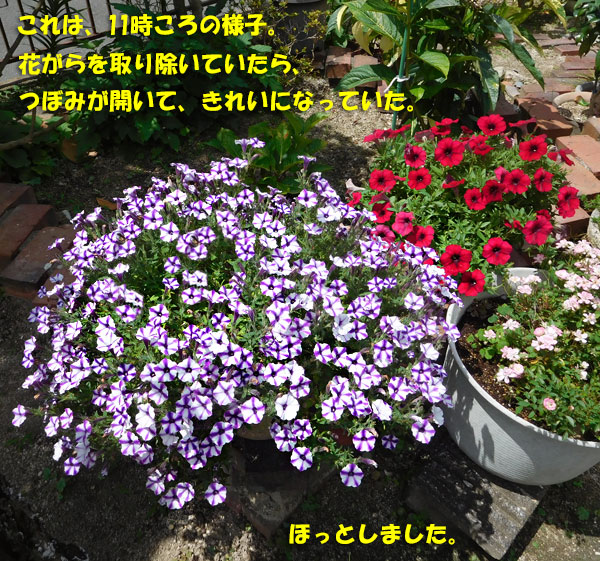 それにしても、このスーパーチュニアは元気ですね。江戸しぼりも雨にぬれると傷むから玄関ポーチに置いているけれど、このスーパーチュニアはずっとこの場所です。ひと株だけなのに、こんなにこんもりしています。