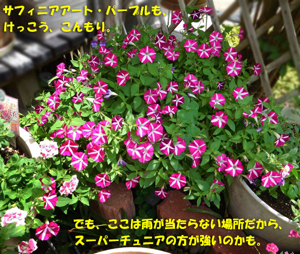 新しい花が濃い色だったサフィニアアートのパープルも、今日になったら、少しピンクに近づいてきたような。