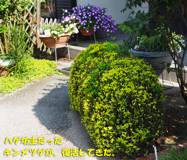 ユウマダラエダシャクの幼虫が、何百匹も発生して、すっかりハゲ坊主になってしまっていた「金芽黄楊(キンメツゲ)」の新芽がだいぶ伸びてきました。元通りになるのも、もうすぐでしょう。