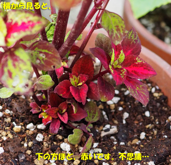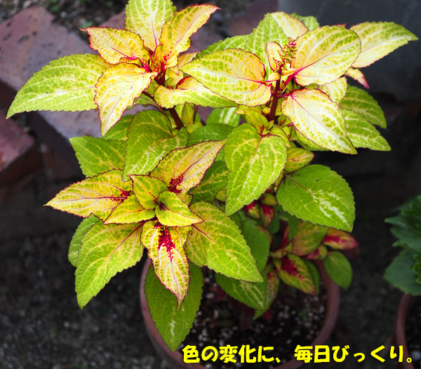 71円、税込み78円で買ってきたコリウスです。黄緑色の葉の真ん中に、かすかにクリーム色の筋が入っていただけだったのに、どんどん濃いピンク色が入ってきた。