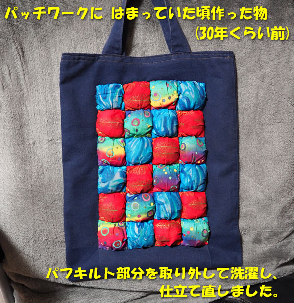 形を手直しして、洗濯し、一旦取り外していたパフキルトをまた縫い付けて完成。