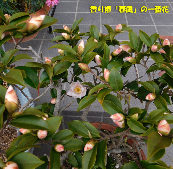 香り椿「春風」の一番花が、だいぶ開いてきました。