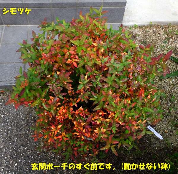 玄関ポーチ前のシモツケが、どんどん赤くなってきています。