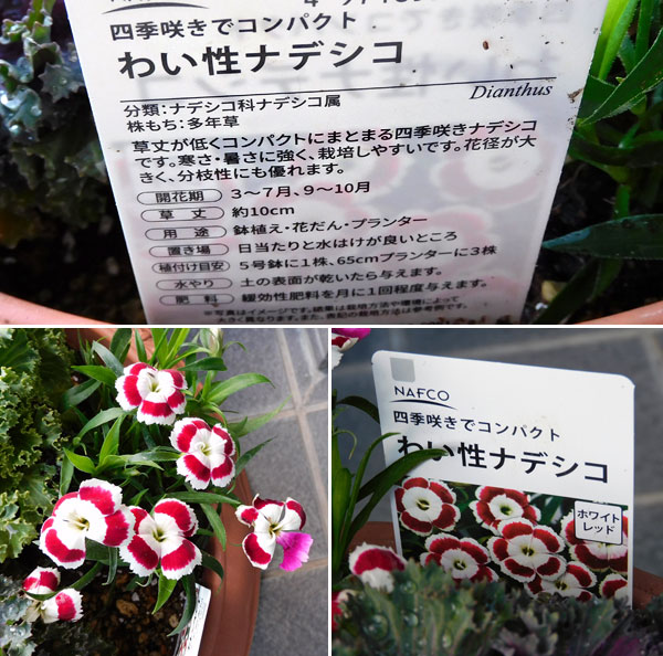 紅白の葉牡丹の両脇に植えたのは「 わい性ナデシコ