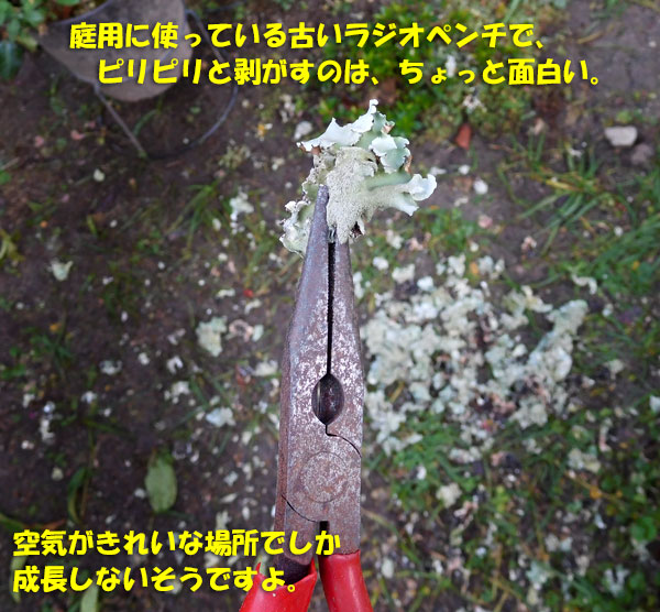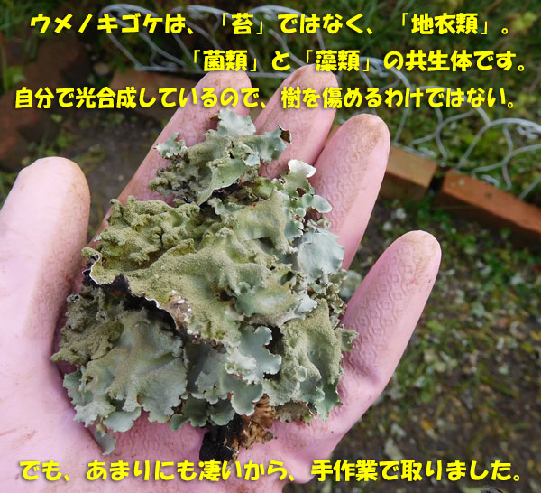 ・びっしりついているウメノキゴケを剥がしてみよう。