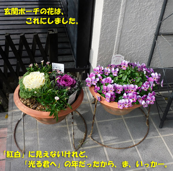 玄関ポーチの花も、ちょっと地味だけど、飾りました。