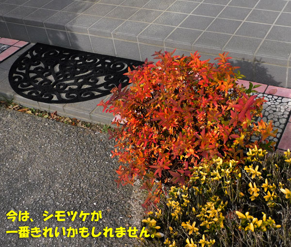 玄関ポーチ前のシモツケが、一番鮮やかかもしれません。