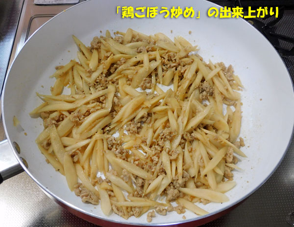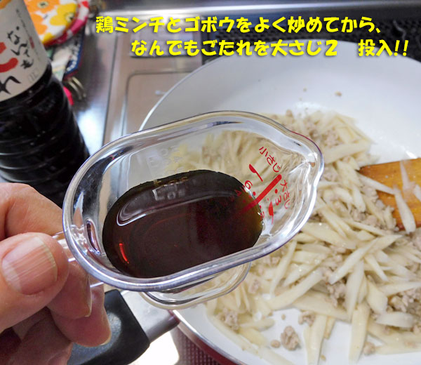 鶏ミンチとごぼうのささがきをよく炒めてから、