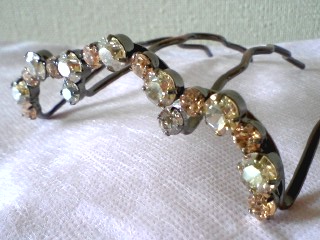 かなーり遅れて到着のFデューですが・・・お色はきれいですよー♪とってもキラキラです・・・がっ!袋から出してコームの足を触った瞬間、うわっ!と小さく叫んじゃったくらいやわっやわな足ですねーウチにあるFミュゼなんて目じゃないくらい!Fミュゼが小鹿足なら・・・Fデューはタコ足!イカでもいいけどwクネクネのグニャグニャですがなーーー!( ̄▽ ̄;)しかもねー・・・ うーーん・・・交換・・・?・・・とも考えたけどぉ~ねいる屋さん今バタバタしてるし、こっちも面倒なんでこのままにしときますw思うに、FミュゼもFデューも、コームの平たいところに直接溶接しているのがそもそも間違いなんじゃないのかと・・・?しっかりした土台に爪留めした石を溶接して、それをコームにつけた方がいいんじゃないのかなー?まぁ、この手のデザイン(フレックスの爪留めコーム)は、もう買わないつもり。挿せない事はないけど、壊れそうで怖いからねーwさて、例の豪華ジルコニアコームメルヴィーユですがーウチにも「おまけ入れ忘れちゃった」メール来ましたよ。おまけがあった事すら覚えてないんですけどねー;31日のメールで、明日大急ぎで送るとあったけど、今日到着のFデューと一緒に来るかも?なんて思ってたらおもいきり甘かったみたいデスwでもさ、31日配送分はお詫びメールより後で配送してるんだからそれに入れてくれれば送料無駄にならないのにねぇ?それとも、入れられない何か事情があったのかしらん?まー、どんなのが来るのか楽しみにしてようっと♪