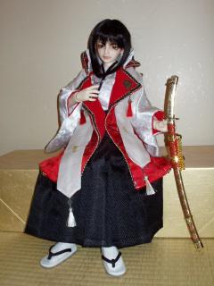 ついに、お着替えしました。ドルパ会場では 『彼』 でしたが、今日からしばらく、『天草四郎時貞』です。 ではでは・・・ですが、先にお断り。写真いっぱい撮ったワリには、好きな角度ばっかりです。色々見たかった方、お許し下さい まだ、「おっかなびっくり」で触れておりますので、座りで全身。 アップで見ると、そんなに垂れ目でもないんですよ。下睫毛のメイクは濃いけど・・・。 着物の生地はなかなかいい感じです。が、ひとつ残念なのが、帯と袴を留める3箇所が、マジックテープなんですよ~なので、せっかくの刺繍の生地を傷めたくないので、着せるのに神経使います。何度も着せ替えたい人には、辛いかも・・・ボタンにして欲しかったけど、ボタンだと手縫いだし、数捌けないから無理なのかな~。 あと、もうひとつ、気になってる方がいるかもしれないので・・・・付いてる靴は「草履」なのに、足は普通足?どうやって「草履」を履くの?って、気になりませんでしたか? わかります?後ろにビニールが付いてるの?このビニールを足首に引っ掛けて、「草履」が脱げないようになってるんです。な・る・ほ・ど・・・・ でした。 明日からは、YUNARI 個人的趣味による、 『ネタ』 になります