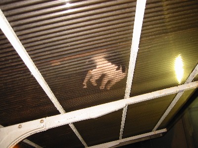 暑くなった頃から、ウチの車庫の上に野良ネコ(?)が寝てます。勝手に 『屋根ネコ』