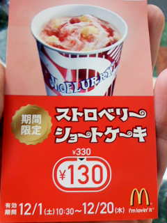 昨日、お昼たまたま家でご飯を作りながらFMラジオを聞いていたら「…先着で…北陸…限定で!フルフローリー新作…200円引き」って聞こえたっ! よーな? 耳の穴かっぽじってラジオのボリューム大にして聞いていたら「番組終了後、北陸3県と静岡限定でマックフルーリー新作ストロベリーショートケーキ定価330円が200円引きの130円で食べられる券が先着100名にプレゼント!」ときたもんだそりゃ~急げぇーーーー!!アピタ内のマックにGOGOGOっ!GETしましたーーー そしてその場でソレだけご注文んー。思ったほど衝撃的な味ではナイ。イチゴアイスだな。ハーゲンダッチョのほうがウマイとマーボーも言う。心持ち、チラシ写真より量が少なくも感じるし…スポンジケーキのかけらも生クリームも、も少し欲しい。でも・・・実際食べたのはマーボーがパクパク食べた後だしホントはもっと具沢山やったんかもぉ~??そんな得したよーな、ちょっと味気なかったよーな日でした