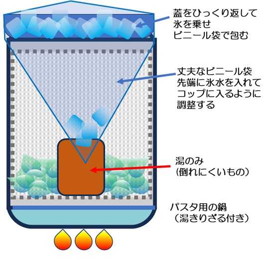| * | ラベンダーオイルを採る装置のカッコよさに感動 ![]() 「水蒸気蒸留」というそうです。 実験大好き人間として憧れます~ まあ,これはムリとしても ハーブウォーターを採る体験はしてみたいな といろいろネットで検索してみると たくさんの素晴らしいアイディアが。 ネットの情報をもとに台所で調理器具を物色した結果, パスタを茹でる鍋を採用。 あとは丈夫なビニール袋とたっぷりの氷を用意。 要はハーブを蒸して,その蒸気を集めればいいのです。 図を書いてみました。 ![]() 本当は中に垂れ下がっているビニール袋にたくさん 氷を入れた方がいいのだと思うのですが 重たくなってしまうため少量で。 ![]() 途中で袋がずれたらオシマイだもの。 蓋に氷を乗せ,水漏れがないかチェック。 まずはベランダからローズマリーを摘んできました。 ![]() 量の見当もつかず,2センチくらい敷き詰めた感じです。 パスタ網に水が付かない程度に水を入れて様子を見ながら ごく弱火で30分くらいコトコトしました。 ![]() 途中で氷がなくなったので追加しました。 外には香りがほとんどしませんので こんな装置ですが閉じ込めには成功しているみたいです。 (ただし加圧されないように注意) 冷めてから取り出してみると…… ![]() 左が湯呑にとれたハーブウォーター。 かなり強い香りがします うっすらと紫ですが何といっても試行回数1ですので こういう色が出るのかは分かりません 右は鍋の底にたまった水で,取り出してすぐはちょっと香りましたが すぐ無臭になりました。ちゃんと蒸気の方に香りが移動したようです。 次にレモンミントでやってみました。 ![]() 茎から葉をはずして敷き詰めました。 ![]() 今回はかすかにミントの香りはするものの 他にサツマイモを煮た時のような甘ったるい匂いが混ざっていて 清涼感とは程遠いものになりました 鍋底の水は濃い茶色になり,弱いですが ハーブウォーターと似たような匂いがします。 残念ながらこれは普通に水にミントを入れておいた方が よっぽどいい感じです。 ……とガッカリだったのですが意外や翌日 甘ったるさが消えてミントの香りの水になりました (弱いけど) 最後にユーカリの葉も試してみました。 こう見ると,普段あまり気にしていませんが, 我が家のベランダには意外とハーブがありました。 勝手に育って元気で手間いらず。ありがたい存在です。 ![]() 葉をはずし,ハサミですこし細かくしました。 このころには家の氷を使い切り保冷剤も使用。 何事も計画性と欲張りすぎないことが大事です。 ![]() これは,まさしくユーカリの香りのハーブウォーターに なりました。 一番そのままの香りが採れたと思います。 出来上がったハーブウォーターを 高分子吸収体のジェルと混ぜ込んで 芳香剤にしてみました。 ![]() ガチャポンのケースの底をテープで止めて再利用してみました。 香りが弱いので机の上とか,近くに置くと楽しめました。 個人的には3つ混ぜると香りが強まって爽やかな香りに なったような気がします またハーブたちが育ったら試してみたいです 頑張ってもらわないと お試しされる方,空焚き,火傷に注意してくださいね。 最後に水蒸気蒸留について調べ学習しました。 (以下,自分で調べただけですので間違いを含む可能性があります 読んでくださる方,間違っているところがあれば教えてください_(._.)_) 学校で習う「蒸留」というのは固体が溶けている水溶液を熱して 液体を取り出す方法のことです。 アルコールと水,石油の精製のように液体の混合物の場合は 「分留」と言います。 いずれも沸点(蒸気圧=外圧)になった液体を取り出す方法です。 ![]() これに対して「水蒸気蒸留」というのは 水蒸気(温度100℃)の状態で,室温より蒸気圧が上がっている香油成分を 水蒸気で取り出す,というイメージのようです(たぶん)。 たとえば ラベンダ―オイルの成分に多く含まれている「リナロール」について ウィキペディアで沸点を調べると約200℃とあります。 ですが,100℃まで温度を上げれば 室温よりは蒸発しやすくなります。 ![]() この状態に水蒸気を通すことによって香り成分を移動させ 水と一緒に集めることを水蒸気蒸留と言うようです。 ![]() ウィキには「水と共沸物となるような物質は取り出しやすい」と ありました。なるほどです。 「蒸留」いう手法にもいろいろあるなと思いました。 ここまで長々とお使いくださった方ありがとうございました パスタ鍋は普通に便利です。 【在庫限り】ヨシカワ SJ3120 トスカーナ パスタポット22cm ガラス蓋付き IH・ガス火兼用 |