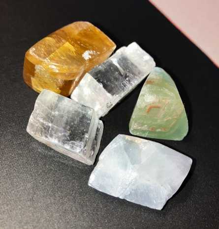 ::::::::::::::サイエンスワークショップ」のガチャポン。 国立科学博物館の売店にあるガチャポンです。最近他の科学館でもちらほら見るようになりました。初めて回したとき,コーパルみがきをゲット。楽しく磨いて,出来上がりにも満足。 (実はこのあと洗面所で落としたら割れてしまい大きさが半分になっちゃってます。ガーンコーパルは割れやすいので注意が必要です)次にゲットしたのが「鉱物の原石磨き」 黄色っぽい方解石(カルサイト)でした。こういう色のカルサイトを「ハニーカルサイト」というようです。炭酸カルシウム(石灰)の鉱物で四角く割れるのが特徴です。「複屈折」といってものが二重に見える性質もあります。炭酸塩なので酸には弱いです。そのあとも,出会うとついつい回し 透明方解石 が出て,おやおやまた方解石?と思っていたら そのあと緑の方解石が出て磨いてもいないうちに青い方解石が出てしまいました。方解石ばっかり……ガーンでも色が違うからラッキーな方かもしれません???コーパルみがきが2024年4月とありますから,1年ちょっとの間に5回も同じガチャを回しちゃってましたちょっとずつラインナップが違うのでついつい回しちゃうんですよね~岩絵の具欲しいな~この際,透明なものも含めてまとめて磨くことにしてメラメラメラメラメラメラゴシゴシゴシゴシ…… 方解石の硬度はさほど高くないのですぐに綺麗になります。 まっすぐなクラックが見えるようになりました。方解石っぽいですね。 ブルーは半透明のものと白っぽい物があるようでこれは透明度が低い「ミルキーブルー」です。グリーンは黄色の模様が入っていますがグリーンは模様が入ることが多いようで,わりとレアな方解石なようです。こちら「カリビアンカルサイト」という名前でした。↓ちょっと雰囲気似てるかな?特別感があると思うと嬉しいです。方解石はいっぱいコレクションできたので次回は方解石がないロットがあったら回してみようかと思います。 * ない気がするな~*designed by