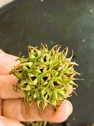 先週,強風が吹き荒れた次の日,公園に遊びに行ったらモミジバフウの実が落ちていました。いつも落ちているのは,種が落ちた後の焦げ茶色のスカスカの実ですがまだトゲも柔らかい,緑色の実も拾うことが出来ました。初めましてです。(実は穴も開いていない状態だったのですが 写真を撮り忘れました。これは3日後くらいの写真。)そのまま放置していたらぽろぽろとなにやらこぼれてきました。1ミリ四方くらいの木のかけらのようなものと,1センチくらいの長さの翼のついた細長い種です。もっとコロンとした種が入っていると思っていました。意外な姿にびっくりです。かけらのようなものは,穴に整然とぎっしり詰まっています。果実と呼ぶにはカサカサに干からびているしとても不思議な存在です。これをピンセットで掻き出すと奥の方から種が出てきますこの様子を見ていて,宅配便に入っている梱包材を思い出しました。↓こういうのマイ種コレクションの中の,翼がある種と一緒に記念撮影をしてみました。モミジやフタバガキの種は落とすとクルクル回りますがモミジバフウの種は上から落としたり,放り投げたりしてもそのままポトンと落ちてしまって羽の効果は感じられません。ちゃんと回りながら落ちる2つの種の羽の大きさは種の5倍近くありますのでモミジバフウは羽が小さすぎるのかな。では,何のために?謎は深まるばかりです。大きな大きな木から落ちてくるときにはそれなりに効果を発揮するのかな。まだ青々した葉っぱ。紅葉が楽しみ。葉っぱを集めながら散歩をしてからもう1年が経ってしまいました。毎日,大切に生活しないとです。モミジバフウの実は,アレンジメントやリースの材料の他に,シュリンプの住処としても利用されるのだそうです。水の中に入れておけるなんて丈夫なんですね。自然界でも川に落ちたりするんでしょうか。自然の姿に思いを馳せる……