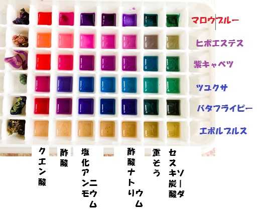 本格的な夏を迎え灼熱の我が家のベランダで涼し気に咲く3つの花。 バタフライピーエボルブルスブルーラグーンツユクサ。どれも美しい青色をしています。ツユクサは実験大好き管理人には草取りされないので,我が物顔でプランターの一員になっています。(ただ,雑草としては綿の花の生育に影響するそうで抜かなければいけないときもありますね。)調べてみると,3つとも紫系のお花に含まれる色素アントシアニンの一種であるディルフィニンという成分が含まれているようです,デルフィニウムにソックリな名前だと思ったら名づけ親のようです。沢山の水酸基がついた構造をしているそうです。こうなっていると青側に引っ張られるんですね。酸アルカリ実験をしてみました。冷凍庫にあった紫キャベツなとの紫系の植物も追加して6種類の水溶液で色の変化を調べました。並べるととっても綺麗ですが,エボルブルスは色水が作れず……うっすらと赤みのある色水が採れたのですが容器に移すと薄茶色。薬品での色の変化なし。残念水には溶けない形のようです。ツユクサとバタフライピーについては紫系の植物に比べて変化しない(青いまま)の領域が広く,酢酸でやや変化,クエン酸でピンクという結果でした。特にツユクサは酸,アルカリいずれも変化が少ないです。お花はすぐに枯れてしまうのに,青の染料は安定しているんですね。さすが昔は染物の下絵に使っていただけのことはあります。ちなみにツユクサは1つ1つの花は小さいですが朝摘み取って冷凍すれば色水の材料としてずっと使えます。いっぱい貯めてpH試験紙を作ったら楽しいかな?バタフライピー,マロウブルーはお茶として市販されています。守山乳業 [公式ショップ] バタフライピーティー 1000g 6本入 MORIYAMA ハーブティー 無着色 天然 青 ドリンク 飲料 紙パック 変化 変色 業務用 お徳用 送料無料 マロウブルーは冷水がおすすめです。2【森のこかげ】 マローブルーティー [1g×15p]「ティーバッグ」 目で楽しめる マロウブルー ウスベニアオイ ブルーマロウ ブルーマロー ハーブティー (残留農薬検査済み) 北海道 沖縄 離島も無料配送可 森のこかげ ハ少T色水実験はこんな風に比較があると楽しいです。製氷皿は白くて見やすく,整理しやすくおススメです。伊勢藤(ISETO) アイスキューブトレー mini フタ付 78個取 製氷皿 日本製 ISETO ホワイト 小粒 カクテル 積み重ね 3個組 【送料無料】これまでも植物を変え,薬品を変え……似たような実験いっぱいしてきました新しい比較対象が見つかるとまたやってみたくなるんです。しばらく眺めて楽しんでいます。