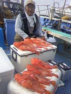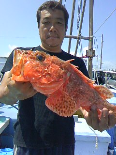 外房大原港~ 鬼カサゴに出船しました (☆。☆) ポイントは大原沖 ε=┏( ・_・)┛ 水深は150mを狙いました p(^^)q 潮の流れが悪くて………………… (;^_^A この場所では、大きさ0.8kgの鬼カサゴを 1匹(;^_^A すぐに場所を移動し ε=┏( ・_・)┛ 次のポイント岩船沖へ ε=┏( ・_・)┛ ここでは水深110mを狙いました (☆。☆) すると……………… 何と w(°0°)w 鬼カサゴを三点掛け \(^O^)/ しかも良型サイズ \(^O^)/ 時間までに 大きさ0.8kg~2kgの鬼カサゴを 0匹~13匹 (^.^)b 型は良型が主体でした (≧▼≦) 外道で 3kgのカンコ(2匹) 沖メバル ハチカサゴ のどグロ も釣れました (^.^)b 全員に鬼カサゴを釣らせることが できなかったのが、悔やまれます (>_<) 出船予定です ………↓……… 明日・8月30日の月曜日は 一つテンヤのシャクリマダイに出船いたします (☆。☆) 今のところ3名のお客さんから予約を頂いております m(__)m 9月4日の土曜日は 一つテンヤのシャクリマダイに出船いたします (☆。☆) 今のところ3名のお客さんから予約を頂いております m(__)m 今後の釣り物予定です ………↓……… メインで 釣って頂いたスルメイカを餌に 【スルメイカ生き餌の泳がせ釣り】 と 外道も楽しめる 【鬼カサゴ】 に出船いたします。 p(^^)q いずれも10名までの乗船とさせて頂きます m(__)m ご予約お待ちしております(^.^)b お客さんへのお願いです m(__)m ………↓……… 勇盛丸では、常にお客さんの安全を考えて操業しております p(^^)q 【安全1番・楽しさ2番・最後に釣果はついてくる♪♪♪】《文明堂カステラのCMのパクリですが…(;^_^A》 をテーマに 命を預かる商売ですので、いつも慎重かつ冷静な操船を心がけております。 その為には、お客さんのご協力が必要不可欠ですので…… 生意気な言い方かもしれませんが 海の上では、マナーと船長の指示を必ず守って下さるよう、お願いいたします m(__)m 。