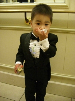 いや~、日記をかなりご無沙汰していました。。。5月20日は、夫の弟の結婚式でした。隣の市の式場で、午後から神式で執り行われました。とてもいい結婚式でした。午前中は晴れていましたが、午後は物凄い雨になってしまいました。でも、終わる頃には雨が上がってくれましたけどね。。。事前の準備などで忙しく過ごしていてつい日記の方がおろそかに・・・。みなさんすみません。いやぁ、身内の結婚式がこんなに慌しいものだとは思いませんでした。義母が運転できないということが大きいのかもしれませんが、美容院へ着物を届けたり、親戚の人が来るので料理を手伝ったり、、、。実家母もかなり協力してくれて、本当に助かりました。侑弥は、BabyStyleJapanさんで購入した◆Babystyle◆スーパータキシード◆子供タキシード◆を着て参加。こんなかんじ・・・・ ちょっと見づらいですが、なかなか好評でしたよ♪でも、サイズが微妙に合わず(ズボンのお尻のところがダボダボしていたり、ワイシャツの首周りが大きすぎたり・・・)母がお直ししてくれました。気になるところは崩して縫い直してくれたりボタンもお洒落なものに付け替えたり・・・。大感謝です。m(_ _)m前日に、行きつけの写真館で撮影もしてもらったので、その写真が出来上がり次第、またUPします♪当日は母が待機してみていてくれたので、挙式のときは預かってもらったりしました。ジっとなんて、していられないもんねぇ・・・。こう考えると、私より母のほうが疲れているのに、どういう訳か私がダウンしてしまい、現在風邪ひきさんです。昨日から実家で面倒をみてもらっています。早く治さないとね・・・。