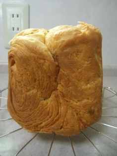 昨日は、実家母が来て、息子を連れて行ってくれたので久しぶりに静かな朝を迎えています・・・夫婦二人だけで生活していたとき、こんなに静かでゆったりとした時間が流れていたのかなぁと思うと、子供との生活っていかにせわしいのか、実感してしまいます、、、。そういえば、最近、私が台所に立ってお菓子やパンを作っているとよく”ちょっかい”を出しに来ます。んで、『みきちゃん、ぶどう食べる?ぶどう、いる?』『みきちゃん、アイス食べる?りんごいる?』しまいには『みきちゃん、いいもの(←蒟蒻ゼリー)頂戴っ♪』(みきちゃん、は私の実名です。)全部お前が食べたいものだろうが・・・。何かをねだる時だけ、『みきちゃん』呼ばわりで、2歳にしてゴマする方法を知ってしまったようで、ちょっと将来が末恐ろしい・・・。(しかも猫なで声だし。)そういえば、この前、ちょっと姿が見えないなぁと思って探していたら、ナント!!うちは洋式トイレなんですが、便座に蓋をしてよじ上って、水を流すレバーを引きながら、タンクの上から流れてくる水(よく、手が洗えるようになってるところ、ありますよね?)に口をつけて飲んでる( ̄□ ̄;;;水を飲みながら『美味しいっ♪うまいっ♪』はぁ・・・・・・・・・。怒る気も失せましたよ・・・・・・・・・。気を取り直して、昨日焼いたパンはコチラっ! ディニッシュ食パン♪中にオレンジピールを練りこんで、ちょっと爽やかな感じ♪味は・・・。お店に売っているのみたい(自画自賛)いや、でも、ホントにうまかったです。一度作ってみたかったんだけど、かなり難しいだろうなぁと思っていましたが、HBを使うとカンタン!コチラの本を参考にさせて頂きました♪取り出す時間、戻すタイミングが、同じ機種なので同じようにできるのがすごく嬉しい♪あと、失敗作のタルト・・・実はこのタルト、普通にギザギザの型で作って、ケーキクーラーでさまして置いておいたら、息子がクッキーと勘違いして壊してしまい、、、( ̄□ ̄;;;仕方なく、それを全部砕いて、バターを少し混ぜてパイ皿に詰めて冷やしたのがコレ。バナナを敷いて、カスタードと生クリームを立てたものを混ぜて上に乗せただけ。だけど、タルトを壊されたのがかなりショックで、色々考えてたら生クリームを立てすぎちゃったのよね(汗)というわけで、ちょっと固めのクリーム。