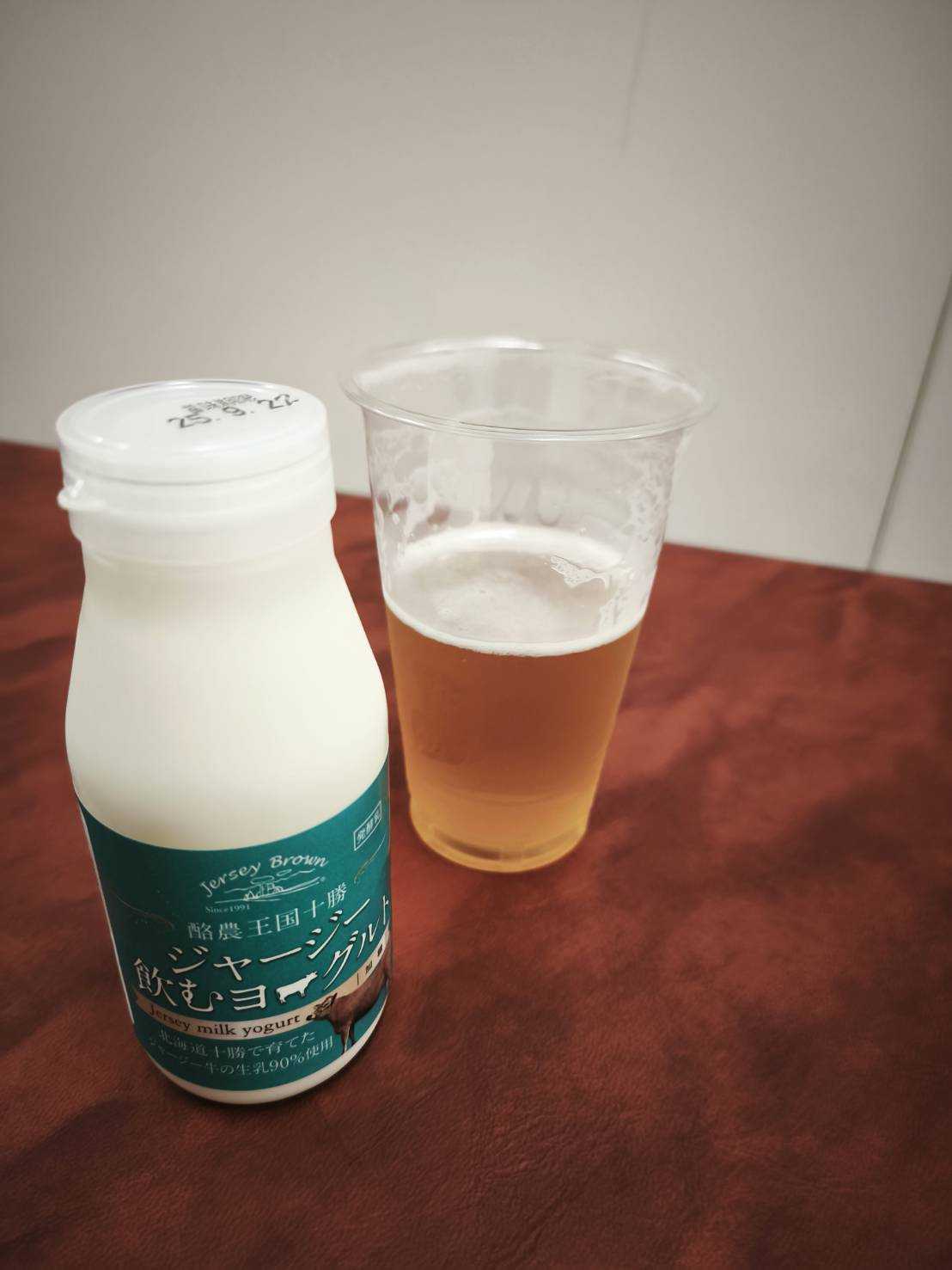 ソフトクリームと飲むヨーグルト飲むヨーグルトとビールウニ丼海鮮丼ザンギと、タコザンギ