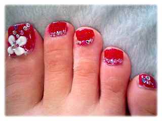 ネイルUP!に載ってたessie454を使ったぺディが、とっても素敵だったので、すこ~し真似させていただきましたっ!!といっても、柚はessieのポリッシュなんてもってない><でもこの色ステキすぎると思い、まずは「紋」の真っ赤を塗りました☆そして、むか~しに買った赤紫系のラメを重ねたら、凄く似た感じにv v v(画像だと、赤に見えてしまうかも><)そして、3Dのお花&ストーンをつけて完成♪3Dはかなり、失敗してしまいました。。。右足↓↓左足↓↓