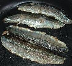 サンマは三枚におろし、腹骨のところを薄くそいで、骨をとり、小麦粉を振る。