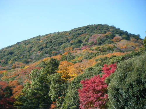 赤黄色 装う山の連なりは 錦の帯の流るるがごと