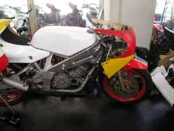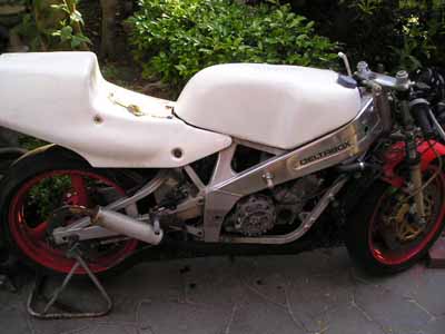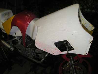 今日もタイガースが勝つのじゃ!どうじゃ、ロッテ!とうとう我が家にやってきました、TZ250レーサー。この車両は大阪のバイクショップBOSSの現社長浜部氏が当時鈴鹿を走った物なのだ~。社長は珍しい飛び級ライセンスをお持ちの偉い人なのであります。ちなみにおいらと誕生日が同じだったりするのであります(キショ~)。8年前社長の慰安旅行のグァムにお供し、そこでナンパしたのがおいらの大事な奥様です。横道にそれました(汗)。滋賀に本部を置くZOOM PATYの元総帥が、鈴鹿スカイライン滋賀側入り口付近、国民宿舎かもしか荘前で週末だけたこ焼屋をやってるのです。今度店舗拡張(新築)に伴いディスプレイ用に飾りたいと・・・ほんでもって、何故かおいらがレストアする羽目になりました。車体周りはBOSSの茨木店に依頼してほぼレストア終了。面倒臭い外装の塗装をおいらがやることになりました。見よ!この見事な石垣模様!絶対プロには真似できないぞ(核爆)。あちこちにヒビや割れ欠け、塗装のチジミに浮き・・・お見事です(涙)。数日前にオークションでカウル&スクリーンをゲットしました。半年間探したけど・・・ちょっとサイズが違うけど妥協します。いらなくなったカウルは本日オークションでお見合いに出しました。貰い手見つかるかな~。我が家にあっても邪魔者扱い、早めに作業開始してたこ焼オヤジの所に持って行こう~っと。ツーリングなどでお近くまでお越しの方は是非寄ってやって下さいね、って、まだ完成してないけど・・・たこ焼屋はやってます。GLトライクが目印です。