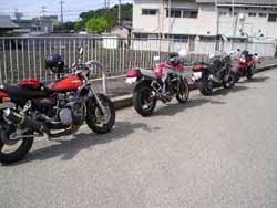 昨夜までの雨が嘘のように晴れました。7時に目覚め、朝食もほどほどに、出発準備。今日は半年振りのライディング・・・ブーツもヘルメットも埃まみれ。まずは埃を落とす事からでした。さあ、Z1ちゃん行きましょうか。セル一発!「キュッ、キュッ、キュ~」 バッテリー昇天。久し振りなので寝起きが悪いのん?車とブースターケーブルで「キュル、キュル、ボーン」 やれば出来るじゃん!素直にお目覚めしなさい。集合場所には既に刀1100が2台、ZZR1100c、が来てました。今日はこんだけ?とそこへBMW Z3(象さん)に乗った新会長到着。「シートをカスタムするのに業者に出したので乗れましぇ~ん」象さんは四輪で参加です。さあ、時間じゃ、しゅっぱ~つ。 いつもと違うコースを巡ってたらとんでもない山道に入ってしまい、うろうろしながらやっと鈴鹿スカイライン滋賀側入り口「国民宿舎かもしか荘」前、「かんべ」に到着。象さん:「遅かったやないか~、小一時間待ったで~」カクガク、シカジカ道に迷いましたm(_ _)mその他にも沢山のライダーがひっきりなしにやってきてました。たこ焼を食し、素敵な時間を過ごしました。後に紹介のメタボリック症候群君にアストロキャンピングカー計画を話したら、「俺も次に買う車(K1BOX)は2段ベットにするで~」痛、た、た、た~「そんなん言われたら計画練り直さにゃ~」Z1もお持ちの同級生中年ライダー。早くZ1綺麗に直そうよ~。やっぱ、Zの方が面白いよ~。忍者900Rに乗る奥様をお持ちのメタボリック症候群。最近おいらの真似して買った刀。そのメタボリック症候群を真似て刀乗りになった、何乗ってもメチャンコ早い。ホントに早い。ライディングホームは何乗っても同じクイックリー。Big1では無く象さんで参加の新会長。こちらもバカッ早い。たこ焼オヤジのGLトライク。今日は客引き(ポン引き)。久々に乗って亀のおいら。フロントローターに歪があるのか、緊急オペにも症状変わらず(涙)。帰りの道中は2段ベット計画が頭の中をグ~ルグル。道を何度も間違えそうになりました。途中でガス欠しそうになりながら帰ってきました。今日は母の日。子供を連れてお食事に出かけました。本当にお疲れの父ちゃんでした。お休み。