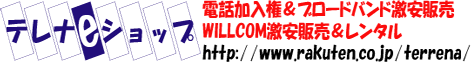 楽天市場の通信総合サイト。電話加入権&ブロードバンドの激安販売。WILLCOM激安販売&レンタル。NTT代理店。Yahoo!BB、OCN、@nifty、So-net、BIGLOBE、ぷらら、DIONの7大プロバイダを網羅。電話加入権の手配から光通信、ADSL、プロバイダの開通までお任せ。創業87年
