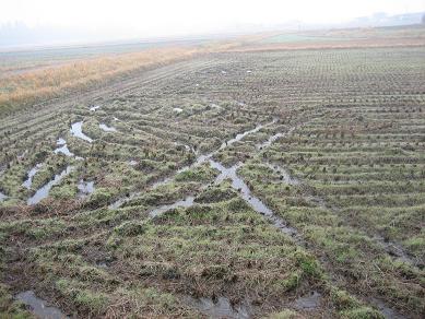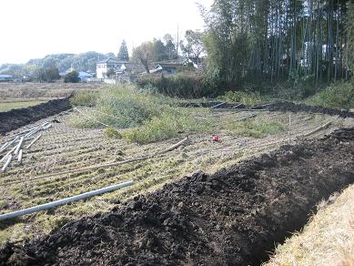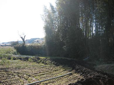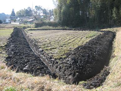 今日は、朝から湿田の排水対策作業でした。作業前の圃場は次の通り。このように、水がたっぷり溜まって抜けません。このような状況では、耕うんから刈り取りまで、機械はじめの作業性が非常に悪くて稲作が実にやりにくいのです。そこで排水対策を施して、水はけのよい圃場にする必要があります。まず、パワーショベル(ユンボ)で掘って行きます。運転手は重おじちゃんです。まず、水口と排水を結ぶ直線を掘り進みます。これが排水の本線です。それから、脇の支線を掘って行きます。このようにして掘って行きます。今日は全部は終わりませんでしたが、だいぶ進みました。私は、この溝の高いところをスコップで取り除いて水平にしたり、この溝に竹を入れるのですが、その竹を切ったりでした。湿田だからベタベタで弱ります。北風は寒くて困りました。道路の近くで、車をとめて人が見たりでした。