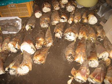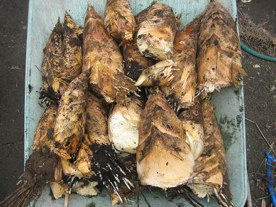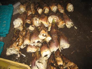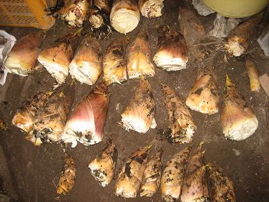 今日は、朝、まず注文のあったたけのこ25本をお届けしました。予約ってのはやはりいいですね。対応には責任が伴いますが・・・その後に、里芋(赤芽)を植えつけです。今日も2列終了して、赤芽は4列終了しました。腰は痛くなりますが、何か作付け面積が増えるのはうれしいですね。あと最低6列は植えつけたいところです。午後はたけのこ掘りでした。今どんどん芽を出して、最盛期になりました。珍しくもなくなったたけのこ・・・ライバルは安くなったので、あまり力を入れないようですので、薄利多売の私は、まだがんばります。今日は、また値下げしましたが、よく売れてました。本数は本当に多くなってますから。1週間は、手がおえないくらい伸びてくるはずです。対応できる範囲でがんばります。でも今日も腰が痛くなって、やめてます。さすがに本数が増えると大変です。明日は里芋はお休み、たけのこを朝掘って、午後は農機具メーカー展示会へgoです。