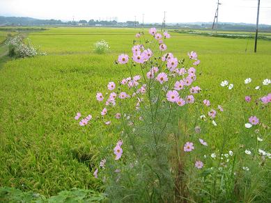 今日はあさから農道作りでした。農地・保全・水管理などの事業の一環でした。新しい農村補助事業です。農村地域一体となって作業を行うことで、地域の環境と農村を育成して行くような事業です。これが午前中かかり、農道に砂利をまいたりして農道を維持管理する作業でした。その後に、飲み会があり、今日はビールを飲んだので、車を使う作業は出来ませんでした。そこで、さといもをむしってあすの産直準備を行いました。雨は降ってません。台風が崩れてくれそうという情報もあり、風はよかったですが、田んぼは虫に食われて・・・雨の2,3日が終われば、我が家も稲刈りを始めようと思います。例年より、10日ほど早いですが、これ以上田をほおっておけませんものね。(虫の被害を)田んぼを背景にコスモスの花を撮影しました。明日は雨ならさといも作業です。天気がよければ稲刈り作業の準備です。
