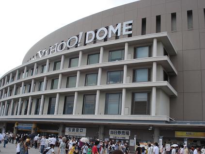 ヤフードームに野球観戦に行ってきました。そもそもものの発端は、GWに宮崎フローランテに行ったことに始まる。そこで、息子はソフトバンクの宣伝隊が、イベントをしていて、ゲームに勝ち抜けば、5月の平日のゲームに招待ということに参加。見事、そのチケットをGETしたことから。でも宮崎に平日に行くには遠すぎて、夏休みにヤフードームへ連れて行くからと約束したことからでした。福岡に住む兄に相談、チケットを入手してもらい、いざ福岡へ。ヤフードームについてホークスグッズをまず買う。メガホン、ユニフォーム、帽子、風船、野球部員のお友達にお土産も。高いけど、揃えないと、むすこの応援のモチベーションはあがらないよう。16:20の開場と同時に球場へ。席は1塁ベースの少し後ろの11列目。まず練習風景を見学。なかなか相手のファイターズの打撃練習が終わらずに嘆く息子。でもその打球がほとんどライナーなのに驚く。ホークスの守備練習に移って、はしゃぐ息子。送球の確かさにまた驚く。試合が始まって、パウエルが投球。1球目の速球にびっくり、それでも140k/mに行かない。しかしそれでも、日本ハムは1番森本がいきなりライト線へ二塁打。4打者連続安打であっという間に3点。4点差になって、3回裏無死1,2塁のチャンスに、本多、川崎、松中と凡退。4回まで8本もヒットされたパウエルの交代はなく、やっと5回二番手竹岡へ。ピンチを切り抜けて、これからというところで、金子誠に手痛い一発。これで、完全に日本ハムペース。それでも、主砲、松中がライト上段へホームラン。この一発で球場へ来た甲斐はあったというもの。日本ハム先発の武田勝は打者を追い込んでは討ち取る上手い投球でした。川崎選手の守備が上手くて感嘆。ホームホースアウト、ダブルプレーなど、捕ってから投げるまでのその速さ。でも日本ハムはチャンスに必ず稲葉というめぐり合わせ。日本ハムの元気さが目立った試合でした。7回の風船飛ばしを楽しみにしていた息子。今日は見事、参加できてうれしそう。ユニフォーム、帽子に身を包みご機嫌さんの息子は今夜は疲れたようで茶の間でうとうとの今です。野球部員の仲間にも土産を配ってうれしそうな息子でした。