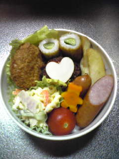 毎日、毎日、お弁当をつくっているわけだけど…はっきり言っておかずに悩む自分だけの弁当なら適当でいいけど彼氏の分も作らないといけないから、手を抜くわけにいかないんだよぉ。毎朝4時起きして作ってるんだけど、なんか、いつも同じような物しか入れてないような気がする…そして、何が一番めんどうかというと、彼氏のお弁当は保温タイプだから味噌汁がいる。ってか、ご飯のときは汁物がほしいんだって毎朝味噌汁作るのも最近は慣れてきたし、朝食用の味噌汁作るついでだからまだいいかなぁ~と思いはじめてきたよ。でも、やっぱり具に困る。ちなみに今日は大根とワカメにしたよ。実家にいる時は味噌汁は月に何回かしか食べてなかったからレパートリーが少ないそれでも、ネットで調べたりしてなるべく毎日違うものを作るようにしてるけど悩むね。なめこ、豆腐、じゃがいも、すり身、卵、大根、たまねぎ、にんじん…大体、この辺を組み合わせてるんだけど難しい。そして、肝心のお弁当のおかずなんだけど…彼氏が異常に好き嫌いが多いだから、困ってる。カボチャだって煮たら嫌いだけど天ぷらにすると食べられるとか調理法によっても違うから悩む。今日のお弁当のおかずは、昨日の夕食がハンバーグだったからお弁当用にミニサイズでハート型に抜いたスライスチーズのせて可愛く(笑)あと、これまた昨日のマカロニサラダ。あとは、ソーセージ、冷凍のカボチャコロッケ、フライドポテト、きゅうり入りちくわ、ミニトマト、茹でてクマさんの型でぬいたにんじん。冷凍食品は好きじゃないみたいだけど、毎回1~2品はお世話になってますちなみに昨日はジャーマンポテト、春雨サラダ、ハムとチーズをクルクルまいてピックにさしたやつと冷凍のから揚げと枝豆を可愛いピックにさしたやつとミニトマト。ミニトマトと枝豆は隙間埋めと彩りにしょっちゅう使ってるよ。あと、ソーセージもよく使うね。まだ、前の日の残りがあるときはいいけど、夕食がラーメンとかだと次の日のお弁当のおかずすべて朝から考えなきゃなのでめんどいです。なにか、簡単でおいしいお弁当のおかずありませんか??お弁当によく使う、アスパラ、ブロッコリーは我が家では禁止です(笑)