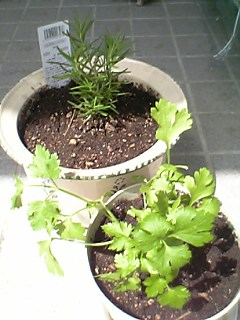 今日はお天気が良かったので先日買ってきたローズマリーとイタリアンパセリも鉢に植え替えてました。手前がイタリアンパセリで奥のがローズマリー。あと、我が家では定番のバジルの種を蒔いてみました。一応、本を見てやったんだけどズボラな私は適当に種蒔いて水やっておしまい。等間隔にキレイに種を蒔くなんてことしません(笑)それと、去年失敗したミントの種もまいたよ。今年こそはうまくいくといいな♪ってパセリ好きなのかな?さっそくキティーがパクリと食べていました