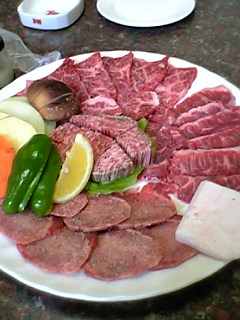 「美味しい焼肉を食べたい!!」と言うことでテレビでも紹介のされたことがある地元では有名なちょっとお値段の高い焼き肉屋さんに行ってきました。私は初めて行ったんだけど、一緒に行った人たちは何度か来たことがあるんでメニューをお任せして楽しみにまってました。そして、そのお店にあったセットメニューの中で1番高いのを注文したんだけど、運ばれてきたお肉、明らかに写真と違いすぎる。写真のは超霜降りで見ただけで美味しそう!!でも、実際に運ばれてきたのは…これ。どう見ても普通っていうか、安っぽい。霜降り??真ん中の牛ロースだけじゃん。写真と全然違う(>_