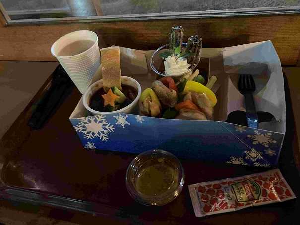 ビーフシチューや洋風焼き鳥(?)、チュロスなどのセットが可愛くて美味でした。