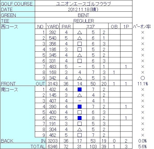 久しぶりのブログ更新・・今年最後のラウンド報告です。実に半月前の結果ですが曖昧な記憶を頼りにご報告~この日は2サムデーで2バック割増料金無し!人気です。なのでヤングやらシニヤやら・・カップルで満員です。言うまでもなく、あたしたち夫婦も中年の2サムカップルです。スタート時間ですがは4台程のカート待ち。おくさん、待ち時間に早くもお疲れ気味・・待ち時間を利用して練習グリーンへ・・グリーン奥のススキ?綺麗です。あたし達は20分程遅れてインコーススタート何度プレーしてもインコースは苦手です。スタートホールのNO10はボギーで済みましたが、続くNo11ティーショットOB!6オン3パットの9!あちゃちゃ・・です。その後は何とか踏ん張りパー、ボギー、パーで少し持ち直しました。NO15のパー3は165yですが左に引っ掛け2オン・・しかしグリーンは思った以上に早くカップを大きくオーバー、結果3パットのダボ・・一進一退です。NO16は打ち降ろしのパー4、ティーショットはカート道路で跳ね300Y越えのビッグドライブ!残りは30y しかし・・チョロってグリーンオンせず・・とほとほ・・アプローチはピン手前1mまで寄り、登りのパットを残し難なくパー!次は超苦手なNO17PAR5のロングです。ティーショットは綺麗なドローでフェアーウェイど真ん中!今日一!でっ!セカンドは残り210Y・・3Wで2オン狙いです。2オンを意識し過ぎて力が入りダフリ! 飛距離100Y・・ティーショットのビッグドライブを帳消しにする見事なミスショット・・課題です。サードショットは何とかグリーン奥に乗り2パットのパー!午前の最終ホールNO18は369Yのミドルの打ち降ろし!ティーショットは右ラフから斜面で跳ね返りフェアーウェイへ・・セカンドがグリーン手前に乗りましたがカップは奥右側・・距離は8m位でしょうか残念ながら3パットのボギーで前半はトータル46!目標のボギーペースにプラス1打でハーフ終了!まぁ~良しとしましょう。クラブハウスへ向かい午後のスタート時間を聞きました。お昼休みは何と1時間45分!プレーしている人数は通常通りですがなんせ2サムデー・・組数が多くカートが足りません。そこでハーフを終了した組のカートから一旦クラブを降し、乗せ換え、なんとかカート数を確保しているのです。利用者の気持ちとしてはカートの数を増やせばいいのに・・なんて思うのですがキングダムゴルフ場は経営努力によりリーズナブルなプレーフィーを保ちつつ近隣のゴルフ場に対抗しているのです。ここは我慢してゆっくり昼食を楽しむ事にしました。昼食はお気に入りの石焼きあんかけ蟹チャーハンを頼みました。おくさんはつゆ無しつけ蕎麦?そんな名前だったような気がします。長いお昼休みを終えて午後のスタートです。志門流素振りで身体を慣らしスタートです。NO1ホール3オン3パットのダボスタート・・続くNO2は午前と同じく7オン2パットの9!!信じられな~い!午前、午後ともに2番目のホールがあたしには鬼門なのですね。続くNO3はムズイPAR3・・はまるとトリプルは当たり前~!ですが何とかはまらずボギーNO4ホールは打ち降ろしの364YのPAR4、ティーショットは右ラフで前方には木がありスタイミー!5アイアンで転がし何とか木はクリア!3オン2パットのボギー!その後、パー、ボギー、パーで9オーバーいい感じです。残り2ホールをパーパーで行けば46、45!91!80台は無理でも今年ベスト2のスコア!しかし・・あ~やはり邪念がスコアを崩します。NO8 池越えショートティーグランドの後ろには紅葉がまだ残っています。綺麗なホールです。しかし・・ダボ・・いよいよ今年最後のホールです。がっ・・NO9最終ホール・・プッシュで1ペナ・リカバリ出来ずトリプル・・がっくし・・結果は・・午後のスコアは50・・トータル46、50の96・・前回と一緒・・スランプに悩んだ今年のあたし・・まぁ~いいっかと言う事でスコアカードはこれ・・今年のラウンドはこれにて終了・・目標であるア年間平均スコア100切りは22ラウンド目で失敗・・自己ベスト更新もこれで失敗・・・今年も目標未達ですが、今年のスイング改造に手応えを感じつつ来年は80台連発意!自己ベスト更新に向け頑張ります!とは言えいつになったらこんな顔で新年を迎えられることやら・・では皆さん今年のラウンド報告はこれにて終了。これから年末に掛けては大掃除特集になると思われ・それでは今日はこのへんでさようなら・・・・あっ! そう言えば・・何と帰宅途中!走行距離、ジャスト6万キロ!撮影成功パフパフパフ~それは・・正丸トンネル手前でした。では皆様・・良いクリスマスをお迎え下さい。おくさんはクリスマスの25日はBzのコンサートらしいです。あたしは?・・近所のおじさんと打ちっぱなしですかね~。おわり・・