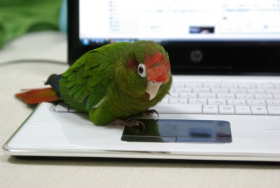 私のノートPCがなぜか大好きなりんちゃん…目を離すと、すぐにこうしてキーボードに乗っかってしまいますわるいわるいインコなのであります。