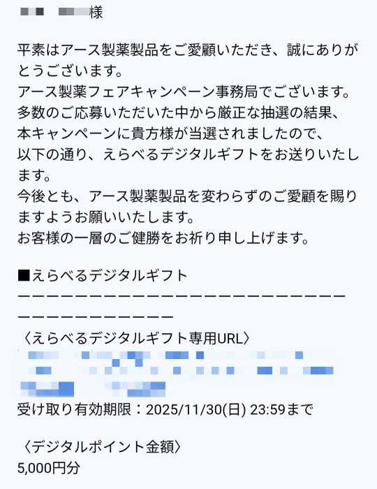 【ご当選のお知らせ】というタイトルで、29日にアース製薬名義からこんなメールが届きました。👇👇👇あ~や~し~~~( ̄▽ ̄;)何のキャンペーンだか全く記憶になかったので最初は迷惑メールの類だと思ったんですが、調べてみたところ、どうやら👇このキャンペーンに当選したようで。そういえばなんか送った気がするぞ…🤔て事で、思い切ってURLをクリックしたところ、本当に5000円分のデジタルギフトが頂けました~~5000円分なんて有難すぎるぅ~。゚(゚இωஇ゚)゚。(172円分はもともと残ってた分です)ー ー ー ー ー ー ー ー ー ー ー ー ー ー ー ー ー ーそしてもう一つ!ぼーのさんのグルメ福袋も、8回目の参加にして初当選🎯\豪華景品が抽選で当たる!/今年はなんとSwitch2が!旅行・米・和牛・美顔器...これも29日にメールが来ていて、1500円以上で使える100円クーポンが当たりました~ヽ(^。^)ノ100円か~~って感じではありますが、当選画面を初めて見れたので嬉しい♪思いがけないダブル当選🎯実は先日誕生日だったので、誕生日プレゼントをもらった気持ちになりました(*ˊᗜˋ*)♡アース製薬さん、ぼーのさん、有難うございました♩▼流れに乗って、これも当選かな!?1000円ポッキリ 送料無料 福引 抽選 G-SHOCK レコルト プレスサンド...抽選日は9/16🎯11日まで販売中!