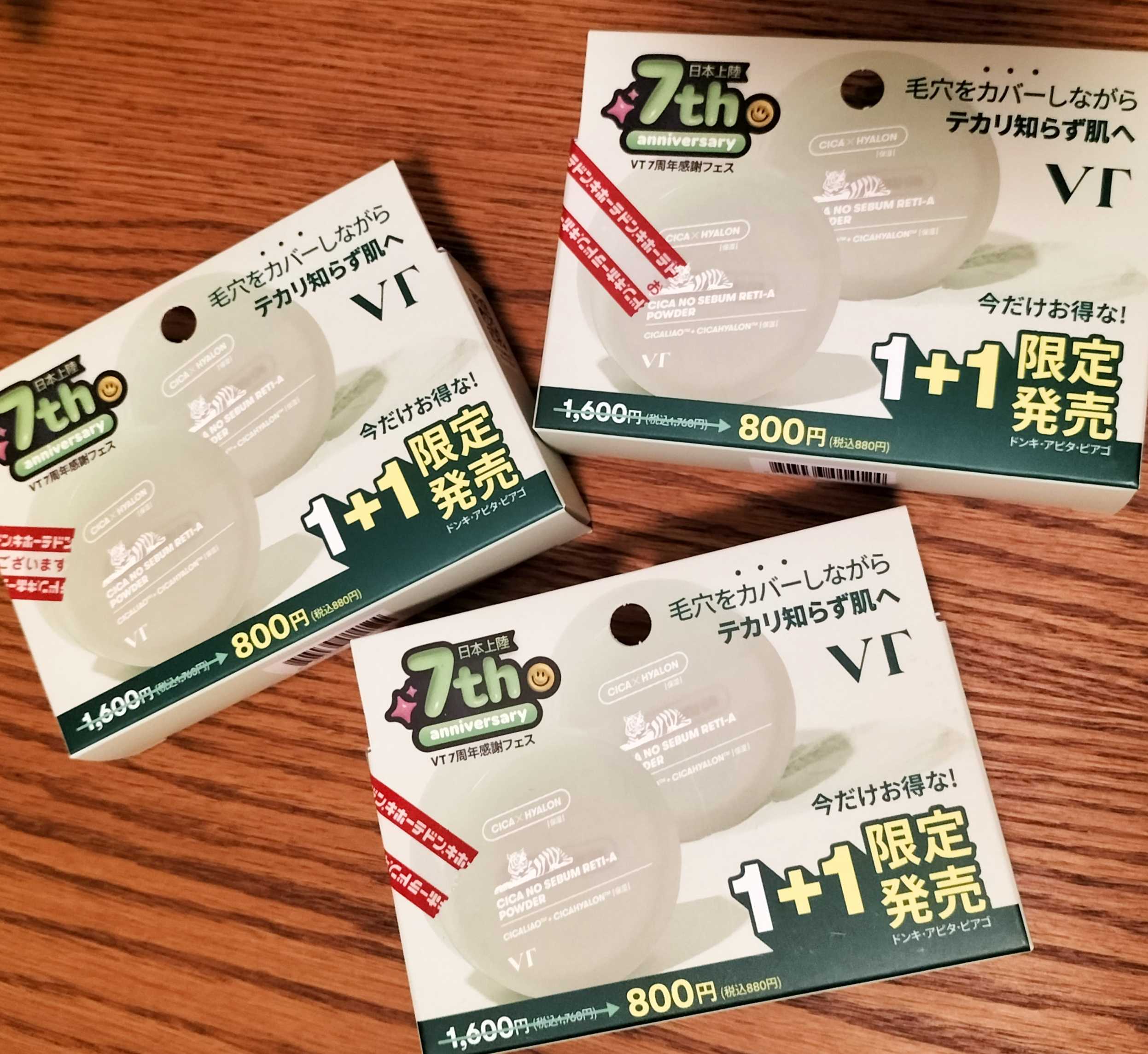 昨日何気なくドンキホーテに行ったら、VTのお得なプラ1セットを見つけたので思わず3つまとめ買い~1つの値段で2つGETできちゃうなんてお得すぎじゃん!?って言っても使うの私じゃないんですが~😅(娘が愛用してます)調べてみたら、日本上陸7周年記念とやらの限定企画セットのようです。私が見た店舗では、■マイルドパウダーが実質43%OFF➡2つで税込841円■シマーとレチAが実質半額➡2つで税込880円で販売されていて、マイルドパウダーには「265冠受賞記念セット」と書かれてました。楽天1位★フェイスパウダー【選べる1~3個】VT CICA NO SEBUM P...販売期間などは分からないので、気になった方はドンキに行ってみて下さいね~▼楽天にパウダーのプラ1セットは見当たらなかったけど、こんなの見つけたよ~💡「ポイント10倍 9月15日」VT(ブイティー) リードルS PDRN+ セラム...「ポイント10倍 9月15日」VT(ブイティー) PDRN+ リードルS 100...「ポイント10倍 9月15日」VT(ブイティー) PDRN+リードルSミスト2個...「ポイント10倍 9月15日」VT(ブイティー) リードルS PDRN+ マスク...もしやパウダー以外のプラ1セットも売ってたのかな~。もっとちゃんと見てみれば良かった~