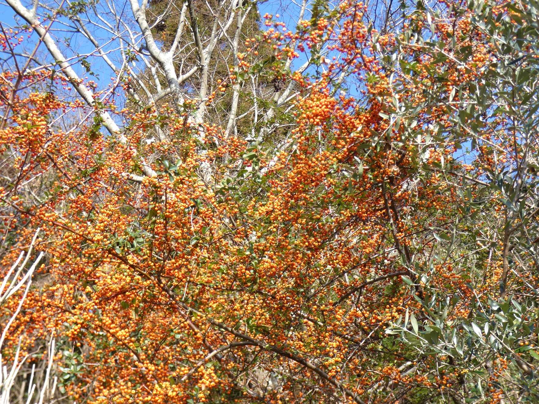 ピラカンサの実はどっさり・午前から陶芸教室かえりにはシシ肉をもらう・ご近所さんには白菜とミカン頂く